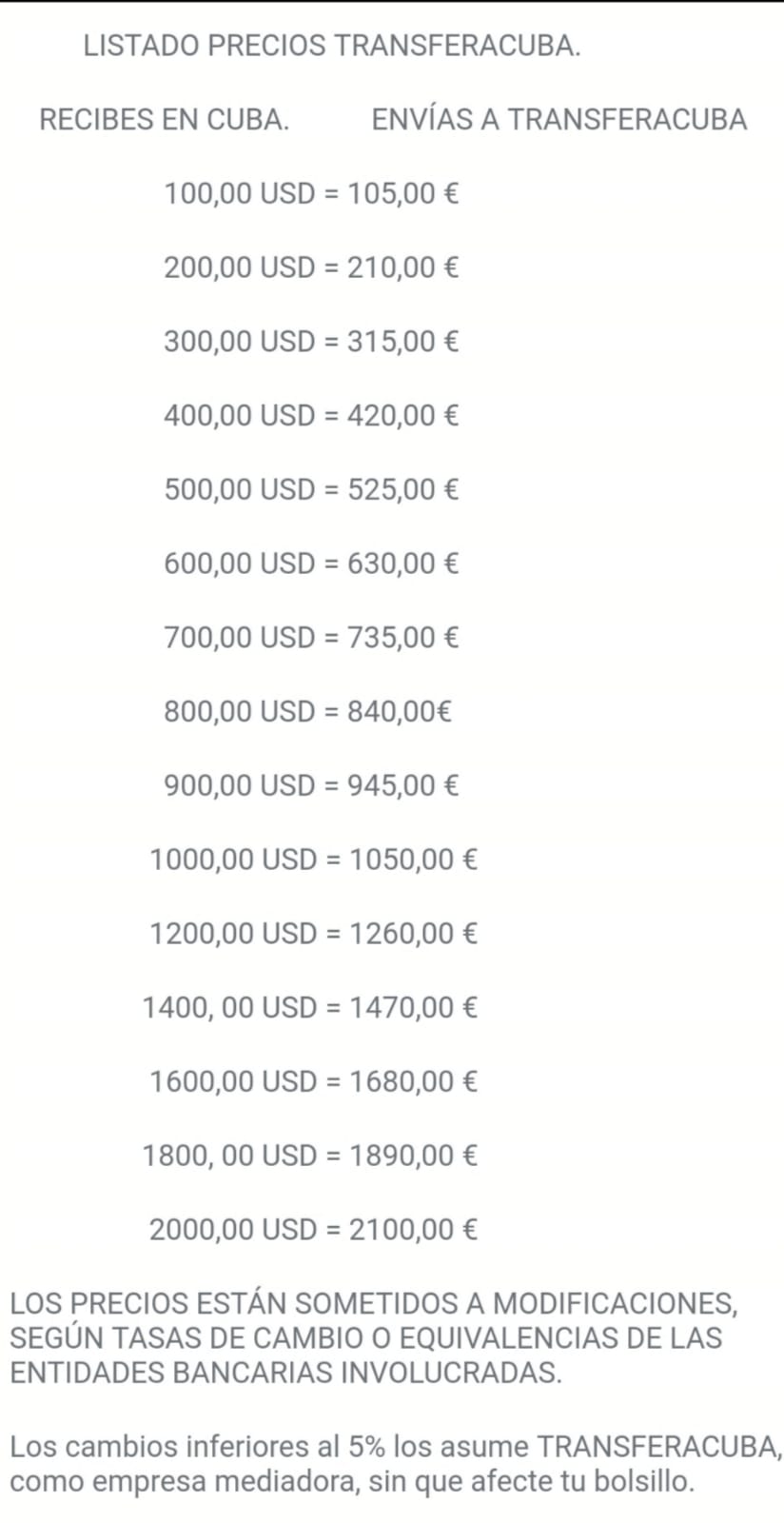 Listado de precios de TransferaCuba